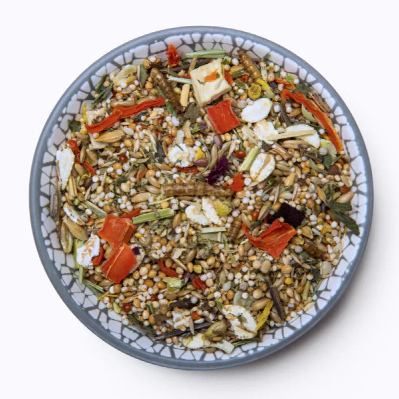 特殊配方提供不同的維生素和微量元素,藜麥、莧菜、紫蘇籽及綠豆提供高品質能量來源。所有成分都很重要,包括含有高比例的種子:小米、亞麻籽及芝麻、美味的麵包蟲乾。