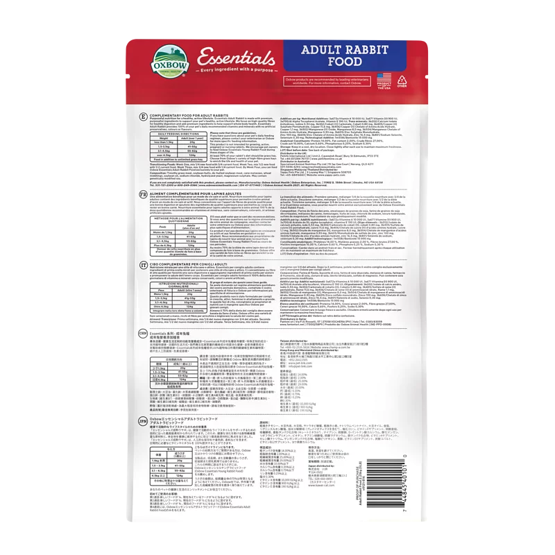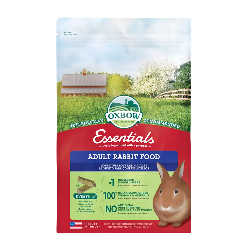 Oxbow Essentials 成兔糧的配方旨在滿足成年兔的特定營養需求並幫助它們茁壯成長。 這種完整而均衡的成年兔糧含有促進健康消化的提摩西乾草以及支持日常功能和表現所需的所有有益健康成分和重要營養素。