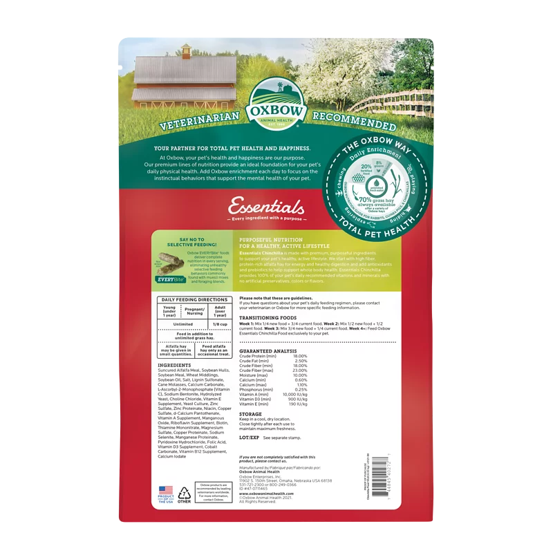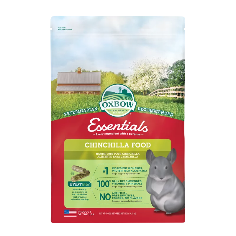 Oxbow Essentials 龍貓糧的配方可滿足龍貓在不同年齡階段的特定營養需求。 這種完整而均衡的龍貓糧含有苜蓿草,可提供最佳能量和健康消化所必需的纖維。 Oxbow 亦添加有益健康的成分和重要營養素,以滿足所有龍貓的日常需求。