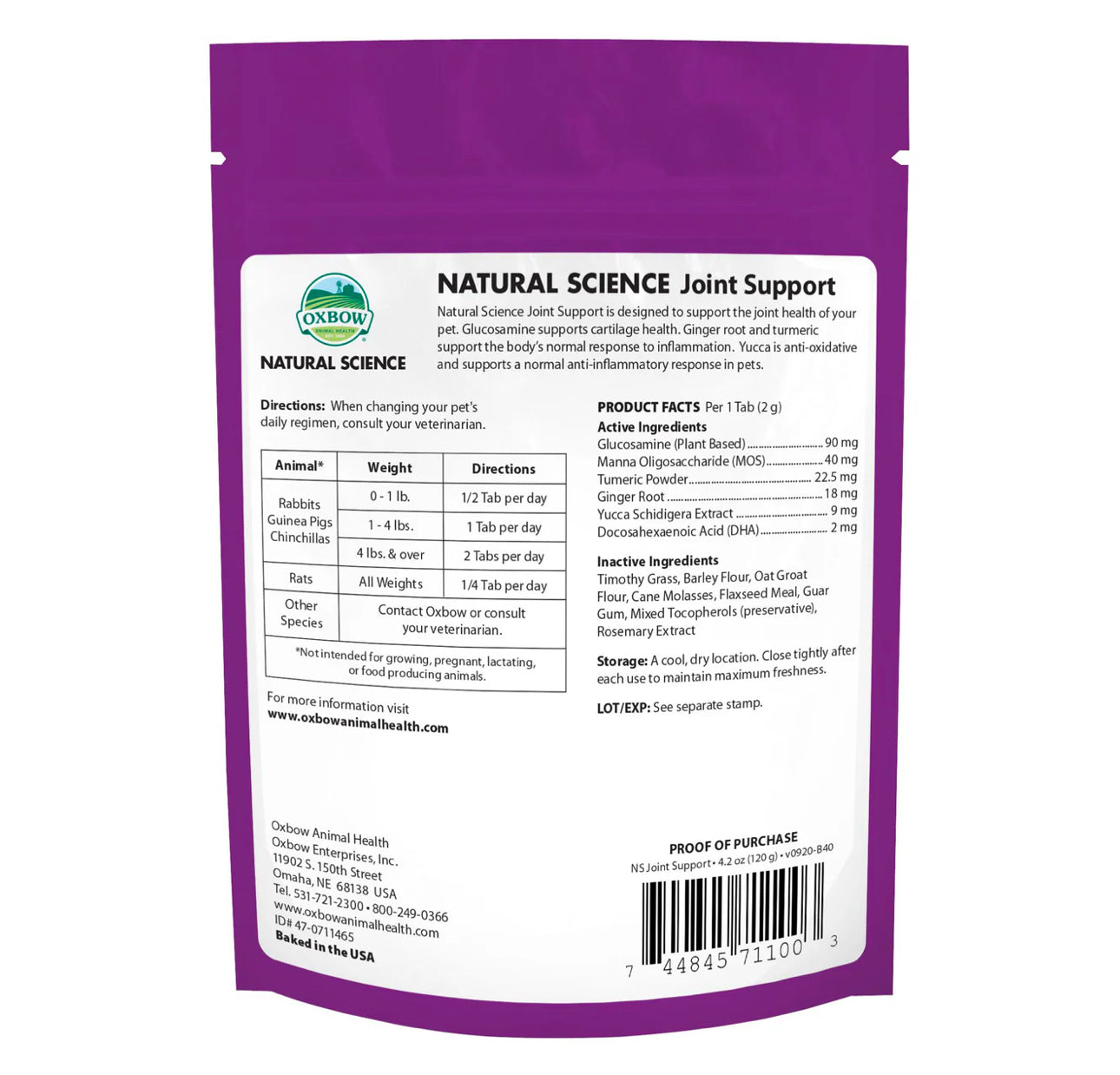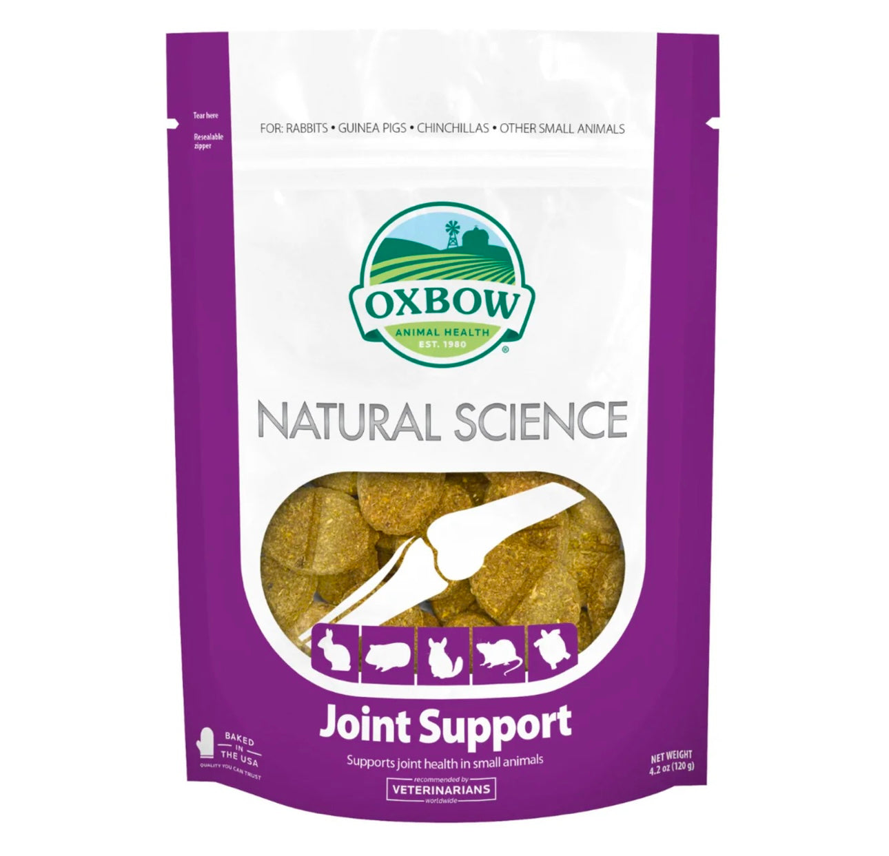 Oxbow Natural Science 強健骨骼補充劑含有高纖維的提摩西草及各種對小寵關節有益的成份。當中的葡萄糖胺可以預防關節退化,而薑黃和絲蘭則有消炎作用