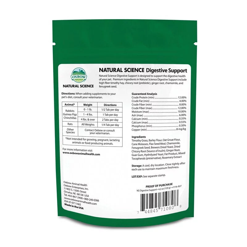 Oxbow NS 消化系統補充劑含有大量纖維,含提摩西草及其他草本成份,保護小動物腸胃健康。其中的菊苣纖維,能促進益生菌成長,更有少量生薑,幫助腸道蠕動。