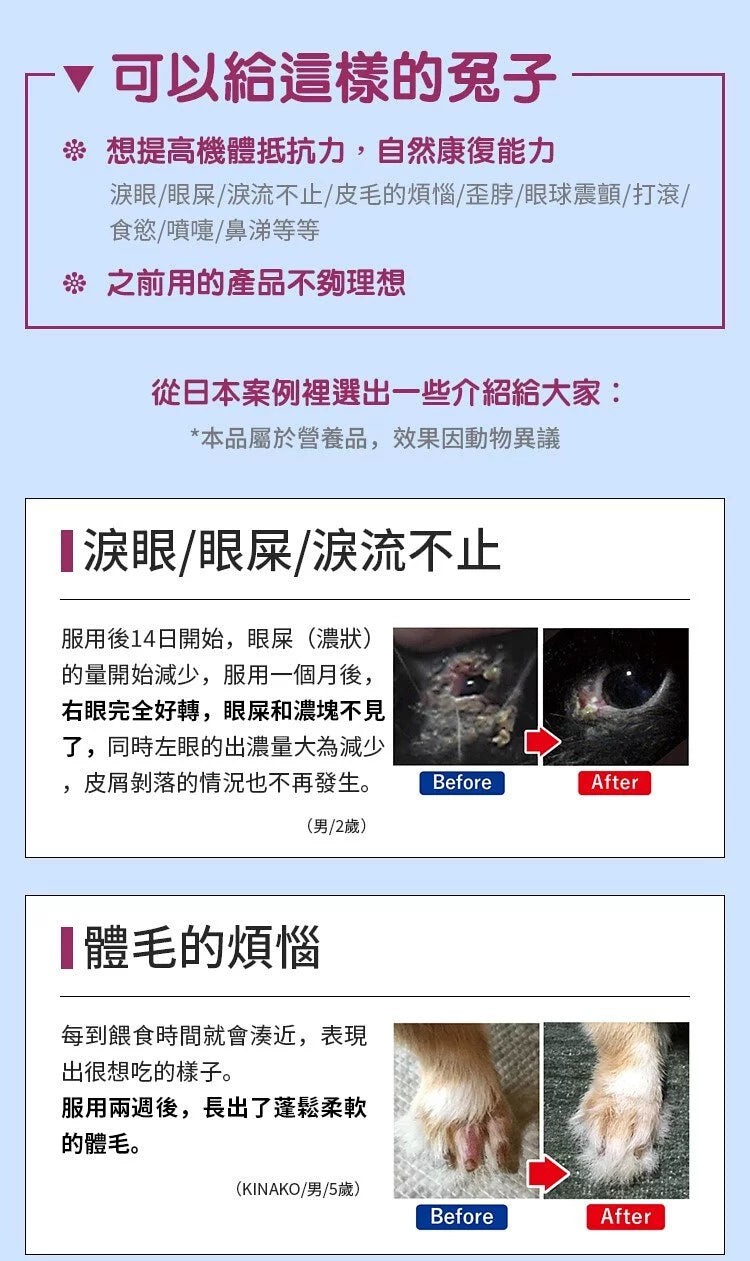 維持全方面的健康,有助於保持免疫力及維持兔子健康(如眼睛,皮毛,身體等)。